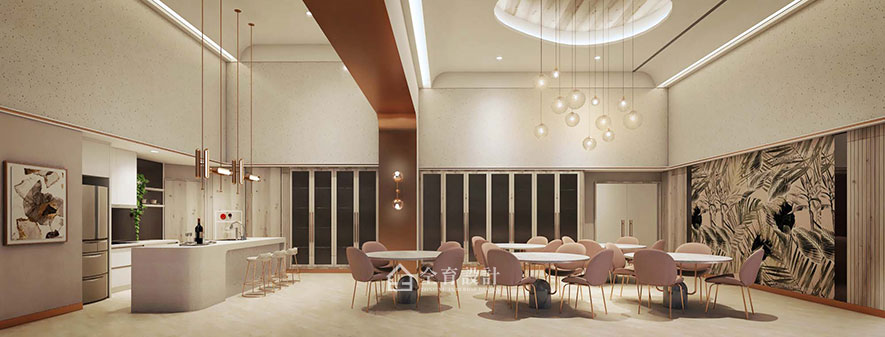 空間中的環境設計理念源自共享概念,而在大門入口設置的綠意植栽,使得通往的公設大廳的路上,充滿樹木成蔭的氛圍,並呈現大樹綠景包圍的景色,讓大樓居民至此皆能度過悠閒時間。