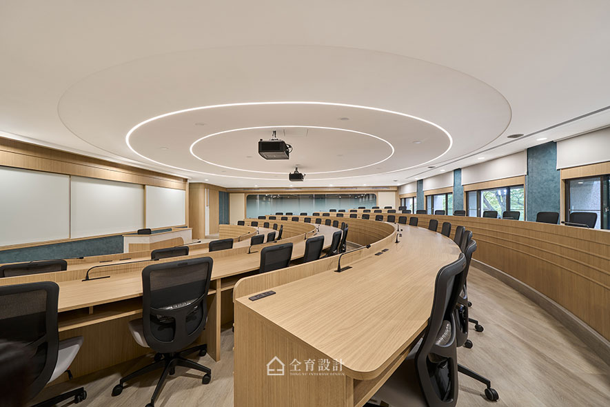 在氛圍營造上,最引人注目的莫過於天花的大型環狀線燈設計,如光環般凝聚視覺焦點,賦予優雅柔和的現代美感。局部牆面以藍綠藝術塗料點綴,引自然綠意入室,平靜的空間感受,也適當紓緩師生課堂中的緊繃壓力。