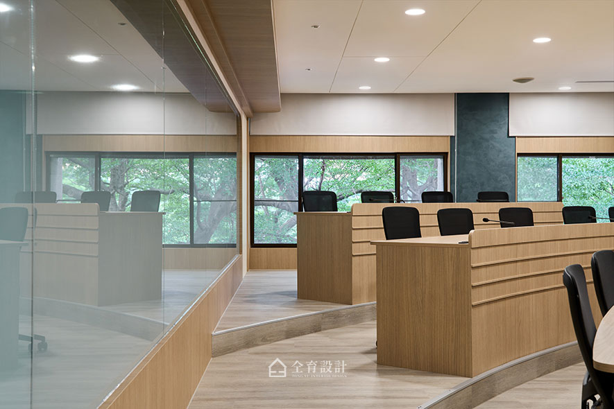 與階梯講堂相鄰的兩間小會議室,在本次翻新中被打通整合,形成更寬敞靈活的會議空間。為使空間擁有舒適氛圍,設計團隊在會議室與階梯講堂的隔間牆,特別嵌入半透明漸層玻璃,使光線能在兩側自由流動,同時保有會議時所需的專注與隱私,也能維持明亮輕透的空間感受,打造具備開放感與獨立性,適合多元交流的會議室空間。