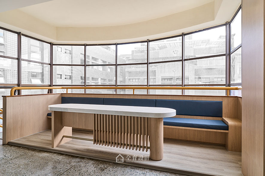休憩區則是廊道空間的一大亮點,為讓師生在課堂外也能休憩與自在交流,設計團隊重新調整桌體比例劃出座位空間,並在桌腳融入格柵設計,兼具通透感與細節美感。四周環繞的窗景映入自然光線,搭配木質元素與藍綠色軟墊座椅,營造自在舒適氛圍。這裡不僅成為行走間的停歇角落,更成為課堂之外的交流場域,使迎賓氛圍在明亮光影中格外輕鬆愉悅。