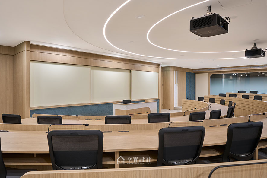 講堂以講台為軸心展開扇形階梯式座位,靈感取自歐美國會議事廳,這樣的規劃不僅拓寬視野,也讓師生互動更加順暢。桌面採圓潤倒角設計,並留意符合人體工學的階梯高度及寬度,讓講堂容納大量學生的同時也能保有舒適安全。