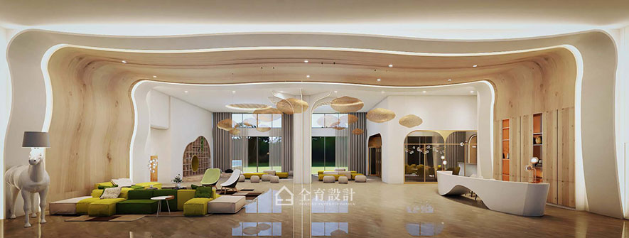 空間中的環境設計理念源自共享概念,而在大門入口設置的綠意植栽,使得通往的公設大廳的路上,充滿樹木成蔭的氛圍,並呈現大樹綠景包圍的景色,讓大樓居民至此皆能度過悠閒時間。