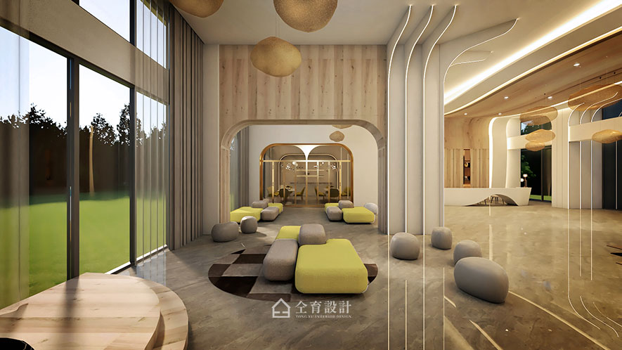 各個公設中的開放空間,裝飾具有透氣滲水功能的石材,並與大自然氣息及陽光串連流通,場域在綠色建築的概念下,彰顯獨特的設計概念。