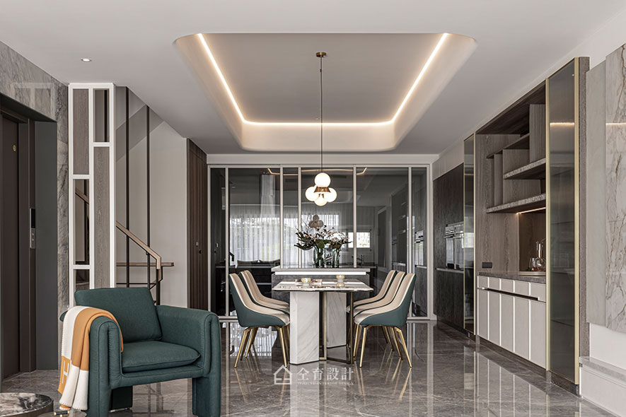仝育設計團隊以「天圓地方」為設計概念,利用天花板造型、水墨畫般的石材裝飾,以及剛柔並濟的空間線條,打造寧靜雅緻的人文氣息;體貼入微的室內動線配置與機能規劃,如主臥的迷你吧台可供屋主歇息、品味生活,多功能室更兼顧長者、孩童、訪客的需求,展現居家美學與生活實用性的完美結合!