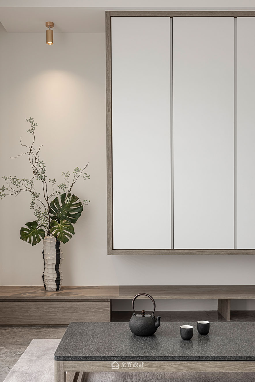 多功能室可供長輩悠然啜茶、主人翻書閒坐、孩童嬉戲玩耍,賓客造訪時亦能化身客房,兼納多元休閒需求;內部牆面設置一座懸浮潔白櫃體,其以簡潔木質框線相偕同色地坪,發散溫潤樸實的自然氣息,中央桌几的黑石檯面則點染一抹純粹沉穩,靜靜托起古樸纖細的茶壺陶杯,描繪寧謐寫意的抒情角落。