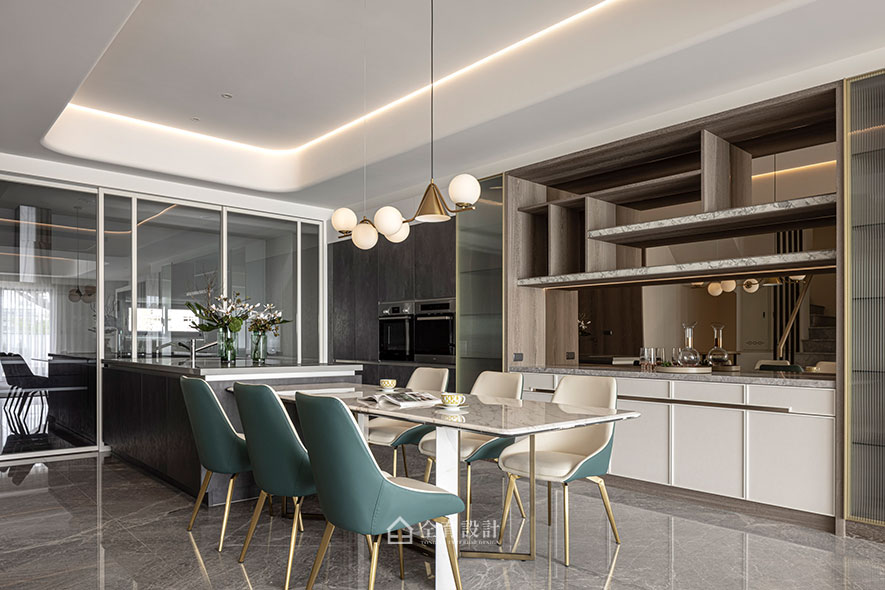 柔綠餐椅的清朗輕盈緩慢爬升,伴隨球形燈飾輕灑的暖光,為愉快談天用餐的家庭時光,再覆層層溫情暖意,而銜接大型中島的長型餐桌,配合旁側融匯木石紋理的餐邊吧檯,既灌注異材質感的視覺層次,亦貼合一家人熱情好客的宴會需求,每當門鈴響起,此區即轉為藝韻滿盈的寬敞交誼場所,讓每一次圍桌相聚的歡樂,充滿無壓自在的舒心感受。