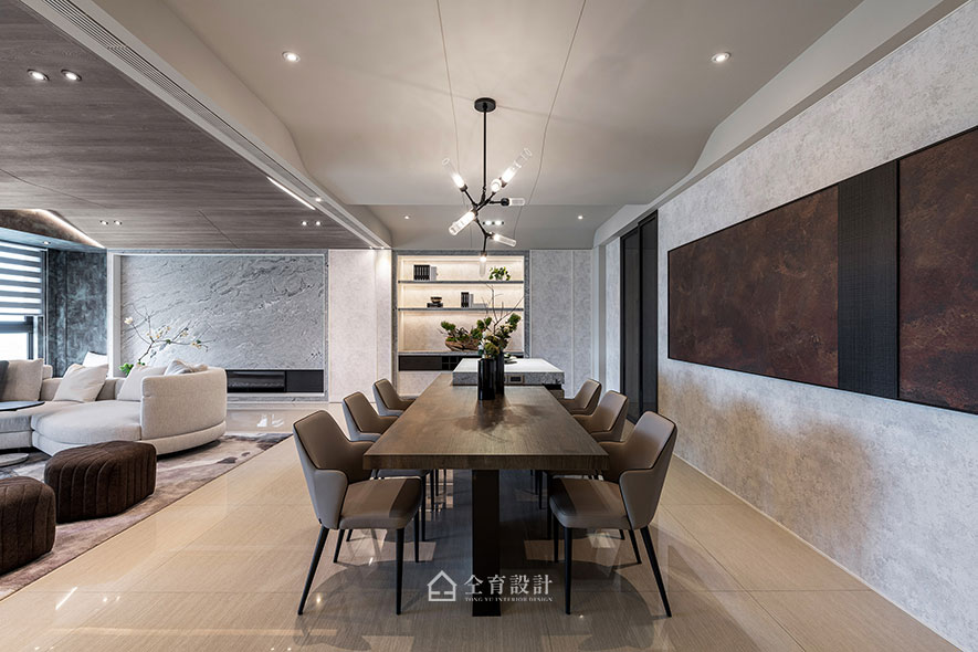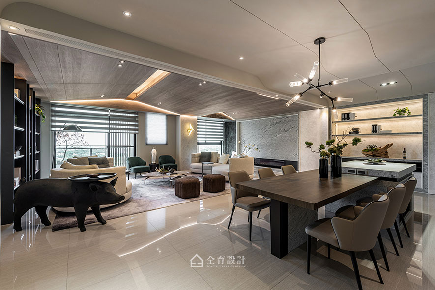 山水景觀的天花板,不僅是令人耳目一新的大膽劃設,亦具體化自然意境,於光線點綴下,投映大川大山畫面——山高水低,山硬水軟,山靜水動,正如太極一陰一陽,提升場域協調度,也回應此案「汐見山」名稱。