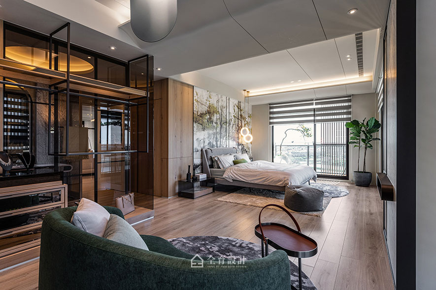 The selected natural textured slates and chill-toned hardware are well matched through Earth-colored home furnishings. Adjacent to the sofa cum bed in the living room, we make use of high-grade verdigris tinge wall panels that work in concert with the two verdant green single chairs and assort with the wooden ceiling to create a leisure and soothing situation. Besides, we place a few green plants on the balcony to interrelate the outdoor scenery and lively grows in the brilliant sunset.