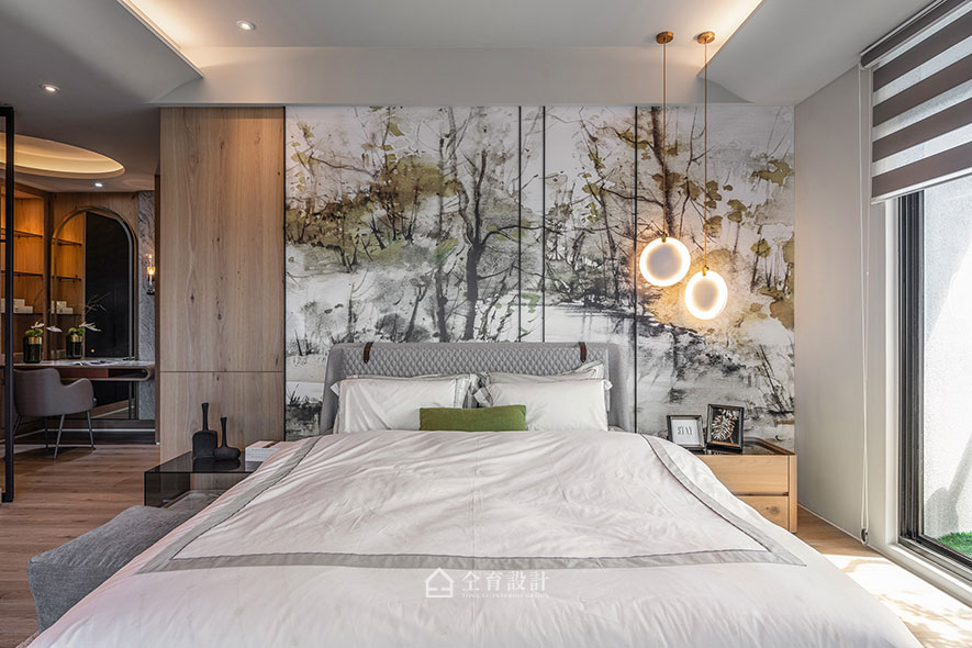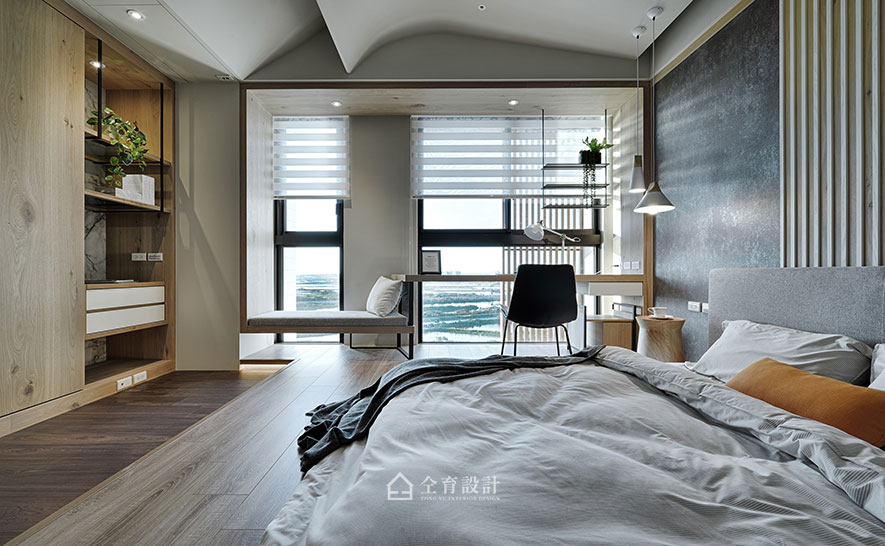 The main bedroom and the hallway to the guest room both equip sliding doors to space out the public area from the tranquil private space, where serves as a friend gathering field. And, we particularly elevate the floor of the secondary bedroom and set a bed without bedstead to meet the demands of receiving visitors or young residents in the future, moreover, ingeniously adds flexible usages of the space.